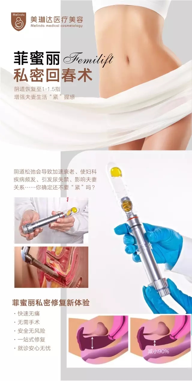 针对有阴道松弛、阴道环境紊乱、敏感度差,或伴有尿、失禁妇科疾病等问题的女性,引进了以色列飞顿公司的私密整形激光设备——菲蜜丽Femilift私密青春激光美容仪,它为这些女性常见问题提供了一套革命性的方案,颠覆了传统产道修复方式:无创**、无麻醉期、无休假期,15分钟即可完成治疗,可拥有长达2年以上的紧致效果。
